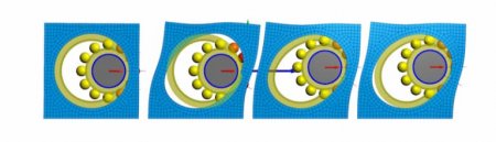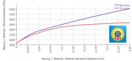 در تصویر 2 منحنی آبی نشان می دهد که استرس تماس با تحمل با ترخیص داخلی، در حالی که منحنی قرمز نشان می دهد تنش تماس با صفر داخلی صفر، اما فاصله بین حلقه بیرونی و مسکن. محدوده ترخیص را می توان به سه بخش تقسیم کرد. برای هر دو مورد در هر دو مورد نتایج یکسان نشان داده شده است، سپس یک دامنه با یک تفاوت ثابت بین دو منحنی وجود دارد. دلیل این سختی خمش حلقه است. در محدوده سوم، تنش تماس با مقدار ثابت در مورد با ترخیص به مسکن روبرو می شود. شرایط عملیاتی معمولی تحمل باید کمتر از 0.05 میلی متر باشد، نمودار فقط برای ترسیم شدن آنچه که برای ترخیص بزرگ رخ می دهد، گسترش یافته است.