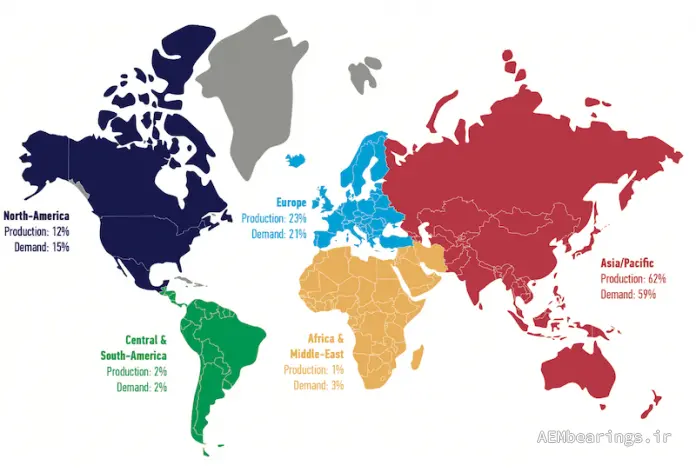 در 5 سال آینده، منطقه آسیا و اقیانوسیه بیشترین درصد رشد را به خود اختصاص خواهد داد که چین و هند در این راه پیشتاز هستند. کشورهای آسیا/اقیانوسیه به دلیل تمرکز بر صادرات و هزینه یابی رقابتی برای تحمل رشد ایده آل هستند. بازار جهانی تحت تسلط شرکت های بزرگ چند ملیتی است. اکثر تولیدکنندگان عمده یاتاقان به طور استراتژیک تأسیسات تولیدی را در کشورهایی با بازارهای داخلی بزرگ متمرکز خواهند کرد. امروزه، چین یکی از بزرگترین بازارهای داخلی را دارد و تقریباً برای هر تولیدکننده عمده بلبرینگ به کانونی تبدیل شده است. این کشور همچنان به رشد منطقه ادامه می دهد و همچنین به تحکیم خود ادامه می دهد. پیشرفته ترین صنایع تولید بلبرینگ در ژاپن، ایالات متحده، سوئد و آلمان باقی مانده است. این کشورها خانه چندین تولید کننده برتر بلبرینگ در جهان هستند. شرکت‌هایی که به این بازارهای توسعه‌یافته بزرگ خدمات می‌دهند، بر بلبرینگ‌های بسیار فنی و با ارزش تمرکز دارند. در حالی که این کشورها تولیدکنندگان داخلی قوی دارند، برای تامین نیازهای اساسی بازارهای داخلی خود به واردات از کشورهای ارزان قیمت متکی هستند.